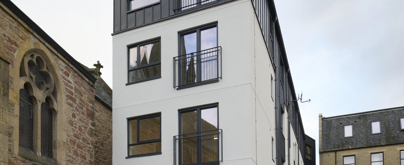 The four-story development has been designed by Colin Armstrong Architects and will provide much-needed affordable housing and purpose-built retail space in Inverness city centre.