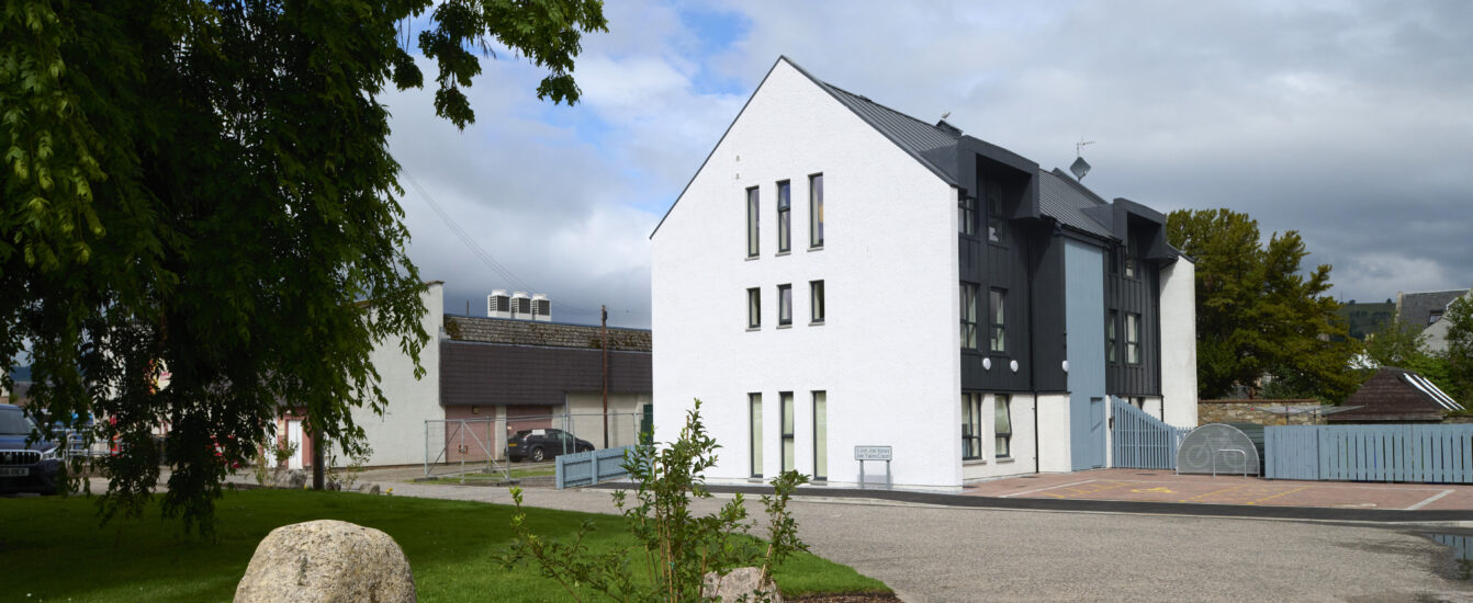 Occupying a prime site on the edge of a conservation area in the centre of busy Highland county town, Dingwall, Joe Yates Court is a flatted development comprising six one-bedroom flats for rental by the local housing authority. Completed in Summer 2021, the development is now fully occupied.